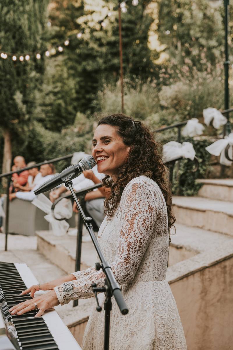 Après la cérémonie laïque a eu lieu le cocktail. Une ambiance chaleureuse piano voix pour commencer et puis au fur et à mesure, l'ambiance a changé pour faire une partie très participative où les mariés se sont mis devant le piano, entourés de leurs invités. Tous ont chanté à tue tête les chansons françaises incontournables hyper connues comme :