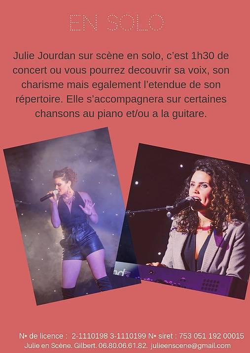 Julie Jourdan sur scène en solo c'est 1h30 de concert où vous pourrez découvrir sa voix, son charisme mais également l'étendue de son répertoire. Cette chanteuse à la voix puissante saura également s'accompagner sur certaines chansons au piano pour une ambiance lounge en début de soirée ou de concert.
